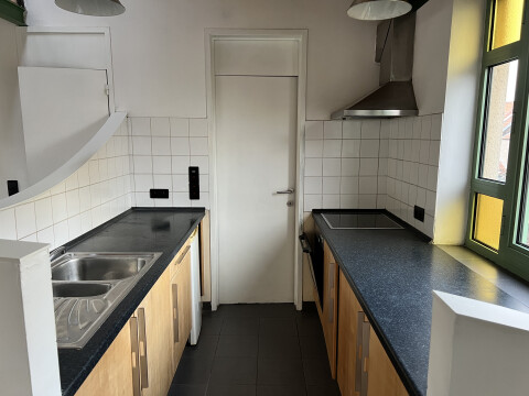 grote leefruimte met open keuken + ramen aan 3 zijden (heel helder)
